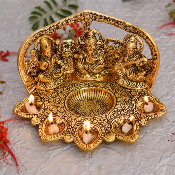 - This handcrafted antique idol of Lord Laxmi Ganesha saraswati with Diya is made of pure gold metal.