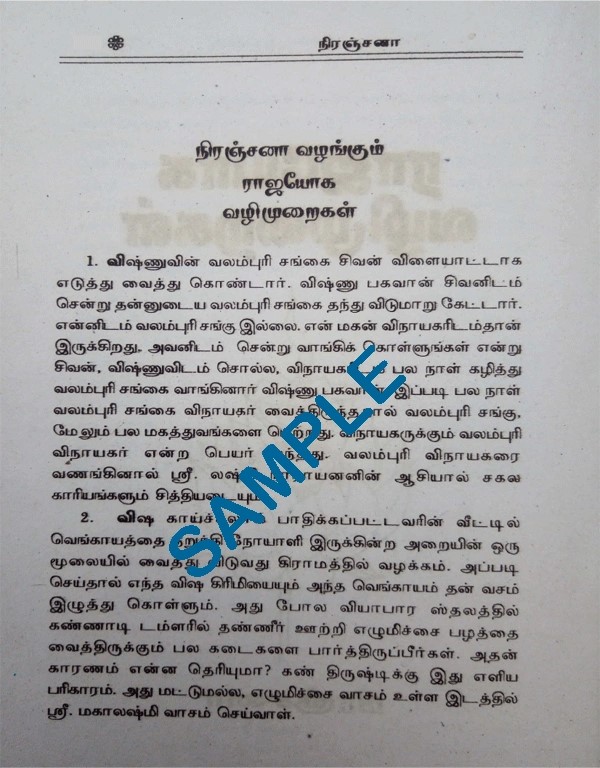 Rajayoga Vazhimuraigal – Tamil E-Book 2 reviews for e-Book ராஜயோக வழிமுறைகள் Rated 5 out of 5 Chandrasekaran (verified owner) – July 1, 2024 சில ஆண்டுகளுக்கு முன் புத்தகத்தை கடையில் வாங்கினேன். எங்கோ தொலைத்துவிட்டேன். இறையருளால் இப்போது அதே புத்தகம் மின்புத்தகமாக கிடைத்ததில் மகிழ்ச்சி. Rated 5 out of 5 Bhavani murugan (verified owner) – July 2, 2024 சின்ன சின்ன ஆன்மிக தகவல்களாக இருந்தாலும் விசேஷமானதாக உள்ளது. Add a reviewCancel ReplyYour email address will not be published. Required fields are marked *Your rating * Rate… Perfect Good Average Not that bad Very poor Name *Email *Your review * Save my name, email, and website in this browser for the next time I comment. Submit